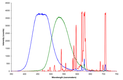 Spectra of constituent blue, green and red phosphors in a common cathode ray tube.