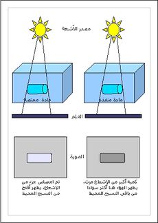 تستخدم المواد المظللة في التشخيص الطبي، لتشخيص تغيرات تحصل في أعضاء معينة في الجسم كالأوعية الدموية مثلاً التي هي في حالتها الطبيعية ممتلئة بالدم، الذي له كثافة إشعاعية مشابهة لكثافة النسيج المحيط (عضلات أو أنسجة رابطة) وبالتالي لا يمكن رؤية الأوعية الدموية على صورة الأشعة. فيتم حقن المادة الملونة في هذه الأوعية الدموية، مما يرفع الكثافة الشعاعية للمحتوى الوعاء الدموي ـ هنا على سبيل المثال ـ ويجعل محتوى هذا الوعاء ومساره واضحاً. كما هو مبين في الصورة التي تظهر القسطرة. وهذا المبدأ يمكن استخدامة في إظهار محتويات كثير من "الأوعية" في جسم الإنسان، مثل الجهاز الهضمي أو المثانة والمجاري البولية ... الخ.