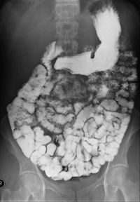 مركبات الباريوم (أيضاً من المواد المظللة الممتصة) ومثالها: سلفات الباريوم، والتي يتم حلها بالماء، ثم شربها، هذه المركبات لا تتحلل ولا يتم امتصاصها من قبل الأمعاء، مما يجعلها ملائمة لإظهار مجاري الجهاز الهضمي ومثالها ظاهر في الصورة. المواد المظللة من نوعية الباريوم تنشط حركة الأمعاء، هذه الخاصية تفسِّر استخدام هذه المواد أيضا كعلاج أو محاولة علاج الإنسداد المعوي، وهناك فائدة أخرى، وهي إمكان مراقبة نتائج هذه المحاولة العلاجية باستخدام الأشعة.