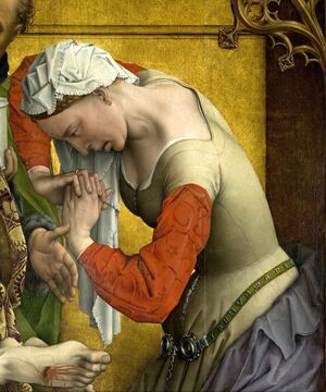 In Pope Gregory's interpretation, the seven demons expelled from Mary Magdalene by Jesus are transformed into the seven deadly sins of medieval Catholicism,[51][49] leading Mary "to be condemned not only for lust, but for pride and covetousness as well."[51] The aspect of the repentant sinner became almost equally significant as the disciple in her persona as depicted in Western art and religious literature, fitting well with the great importance of penitence in medieval theology. In subsequent religious legend, Mary's story became conflated with that of Mary of Egypt, a repentant prostitute who then lived as a hermit. With that, Mary's image was, according to Susan Haskins, author of Mary Magdalene: Myth and Metaphor, "finally settled...for nearly fourteen hundred years,"[49] although in fact the most important late medieval popular accounts of her life describe her as a rich woman whose life of sexual freedom is purely for pleasure.[56] This composite depiction of Mary Magdalene was carried into the Mass texts for her feast day: in the Tridentine Mass, the collect explicitly identifies her as Mary of Bethany by describing Lazarus as her brother, and the Gospel is the story of the penitent woman anointing Jesus's feet.[57]