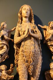 The most famous account of Mary Magdalene's legendary life comes from The Golden Legend, a collection of medieval saints' stories compiled circa 1260 by the Italian writer and Dominican friar Jacobus de Voragine (ح. 1230 – 1298).[10][9][69] In this account, Mary Magdalene is, in Ehrman's words, "fabulously rich, insanely beautiful, and outrageously sensual",[10] but she gives up her life of wealth and sin to become a devoted follower of Jesus.[10][69] Fourteen years after Jesus's crucifixion, some pagans throw Mary, Martha, Lazarus (who, in this account, is their brother due to a conflation with Mary of Bethany), and two other Christians named Maximin and Cedonius onto a rudderless boat in the Mediterranean to die.[10][69] Miraculously, however, the boat washes ashore at Marseille in southern France.[10][69] Mary persuades the governor of the city not to offer sacrifices to a pagan god[10] and later persuades him to convert to Christianity after she proves the Christian God's power by successfully praying to Him to make the governor's wife pregnant.[10][69] The governor and his wife sail for Rome to meet the apostle Peter in person,[10] but their ship is struck by a storm, which causes the wife to go into labor.[10] The wife dies in childbirth and the governor leaves her on an island with the still-living infant at her breast.[10] The governor spends two years with Peter in Rome[10] and, on his way home, he stops at the same island to discover that, due to Mary Magdalene's miraculous long-distance intercession, his child has survived for two years on his dead mother's breast milk.[10] Then the governor's wife rises from the dead and tells him that Mary Magdalene has brought her back.[10] The whole family returns to Marseille, where they meet Mary again in person.[10] Mary herself spends the last thirty years of her life alone as a penitent ascetic in a cave in a desert in the French region of Provence.[69][70][71][72][73] At every canonical hour, the angels come and lift her up to hear their songs in Heaven.[69] On the last day of her life, Maximin, now the bishop of Aix, comes to her and gives her the Eucharist.[69] Mary cries tears of joy[69] and, after taking it, she lies down and dies.[69] De Voragine gives the common account of the transfer of Mary Magdalene's relics from her sepulchre in the oratory of Saint Maximin at Aix-en-Provence to the newly founded Vézelay;[74] the transportation of the relics is entered as undertaken in 771 by the founder of the abbey, identified as Gerard, Duke of Burgundy.[75]