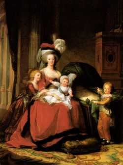 ماري أنطوانيت وأطفالها, 1786-1787. صوفي هلين بياتريس, أصلاً في المهد, مـُحـِيـَت من الصورة بعد وفاتها. بريشة Marie Louise Élisabeth Vigée-Lebrun