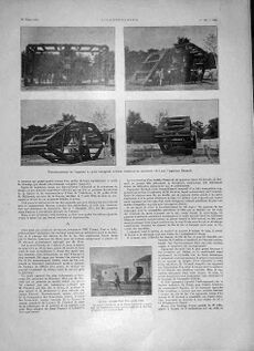 This device proved too fragile and slow however, as well as incapable of changing direction easily, as was indicated by a report on 17 May. The project was officially abandoned on 10 June 1915.[3] Upon the insistence of the inventor, modifications were made, a new commission was formed and new trials organized on 4 November 1915,[3] for the benefit of the Engineer Arm. The machine, loaded with nine tonnes of simulation weights, successfully flattened an eight metre wide barbed wire obstacle, overcame a funnel with a diameter of five metres and crossed a trench two metres wide. It reached a speed of 1,6 km/h. A second test on 13 November showed however that it was still extremely difficult to change direction. The whole assembly had to be lifted by a main jack, after which it could be turned for a maximum of 45° by hand from the outside or by a system of smaller jacks from the inside of the machine. Again the project was rejected, because of its visibility, noise, vulnerability, low speed and lack of manoeuvrability. Military historian Lieutenant-Colonel André Duvignac concluded that those that had baptised it Diplodocus militaris (after a giant sauropod dinosaur, well known at the period) "were not only poor humorists but also good judges".[5]