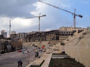 The terrace and Jerusalem stone covered parking garage with construction in the background (January 2007).