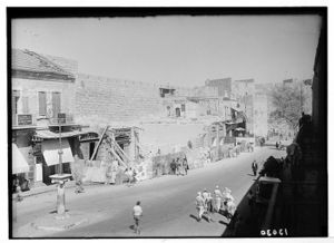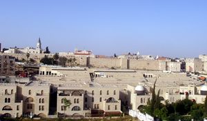 Modern Mamilla; the walls surrounding the Old City of Jerusalem can be seen in the background.