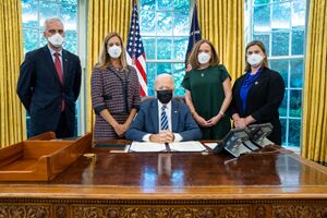 In 2019, Sherrill initially opposed exploring the first impeachment of President Donald Trump, but she changed her mind in September after a whistleblower alleged that Trump pressured Ukrainian President Volodymyr Zelensky to investigate Joe Biden.[54] According to one report, Sherrill was instrumental in motivating House speaker Nancy Pelosi to proceed with the impeachment inquiry and said her "grave concerns" about Trump's behavior were "rooted in self-sacrifice and principle".[55] An op-ed she co-wrote with six other freshman Democrats with national security backgrounds—Houlahan, Luria, Gil Cisneros, Jason Crow, Elissa Slotkin and Abigail Spanberger—said that "everything we do harks back to our oaths to defend the country" and described the claims against Trump as "a threat to all we have sworn to protect".[56]