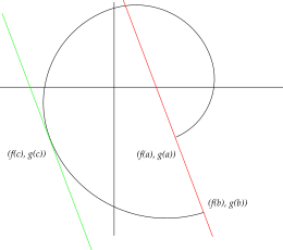 which is parallel to the line defined by the points (f(a), g(a)) and (f(b), g(b)). However Cauchy's theorem does not claim the existence of such a tangent in all cases where (f(a), g(a)) and (f(b), g(b)) are distinct points, since it might be satisfied only for some value c with f′(c) = g′(c) = 0, in other words a value for which the mentioned curve is stationary; in such points no tangent to the curve is likely to be defined at all. An example of this situation is the curve given by