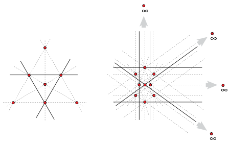 The question of the existence of an ordinary line can also be posed for points in the real projective plane RP2 instead of the Euclidean plane. The projective plane can be formed from the Euclidean plane by adding extra points "at infinity" where lines that are parallel in the Euclidean plane intersect each other, and by adding a single line "at infinity" containing all the added points. However, the additional points of the projective plane cannot help create non-Euclidean finite point sets with no ordinary line, as any finite point set in the projective plane can be transformed into a Euclidean point set with the same combinatorial pattern of point-line incidences. Therefore, any pattern of finitely many intersecting points and lines that exists in one of these two types of plane also exists in the other. Nevertheless, the projective viewpoint allows certain configurations to be described more easily. In particular, it allows the use of projective duality, in which the roles of points and lines in statements of projective geometry can be exchanged for each other. Under projective duality, the existence of an ordinary line for a set of non-collinear points in RP2 is equivalent to the existence of an ordinary point in a nontrivial arrangement of finitely many lines. An arrangement is said to be trivial when all its lines pass through a common point, and nontrivial otherwise; an ordinary point is a point that belongs to exactly two lines.[2]