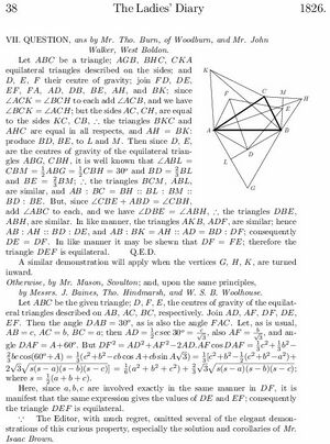 Plainly there is no reference to Napoleon in either the question or the published responses, which appeared a year later in 1826, though the Editor evidently omitted some submissions. Also, Rutherford himself does not appear amongst the named solvers after the printed solutions, although from the tally a few pages earlier it is evident that he did send in a solution, as did several of his pupils and associates at Woodburn School, including the first of the published solutions. Indeed, the Woodburn Problem Solving Group, as it might be known today, was sufficiently well known by then to be written up in A Historical, Geographical, and Descriptive View of the County of Northumberland ... (2nd ed. Vo. II, pp. 123–124). It had been thought that the first known reference to this result as Napoleon's theorem appears in Faifofer's 17th Edition of Elementi di Geometria published in 1911,[10] although Faifofer does actually mention Napoleon in somewhat earlier editions. But this is moot because we find Napoleon mentioned by name in this context in an encyclopaedia by 1867. What is of greater historical interest as regards Faifofer is the problem he had been using in earlier editions: a classic problem on circumscribing the greatest equilateral triangle about a given triangle that Thomas Moss had posed in the Ladies Diary in 1754, in the solution to which by William Bevil the following year we might easily recognize the germ of Napoleon's Theorem - the two results then run together, back and forth for at least the next hundred years in the problem pages of the popular almanacs: when Honsberger proposed in Mathematical Gems in 1973 what he thought was a novelty of his own, he was actually recapitulating part of this vast, if informal, literature.