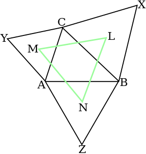 In the figure above, ABC is the original triangle. AZB, BXC, and CYA are equilateral triangles constructed on its sides' exteriors, and points L, M, and N are the centroids of those triangles. The theorem for outer triangles states that triangle LMN (green) is equilateral.