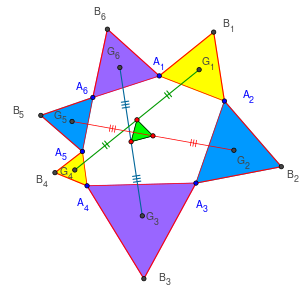 - If isosceles triangles with apex angles 2kπ/n are erected on the sides of an arbitrary n-gon A0, and if this process is repeated with the n-gon formed by the free apices of the triangles, but with a different value of k, and so on until all values 1 ≤ k ≤ n − 2 have been used (in arbitrary order), then a regular n-gon An−2 is formed whose centroid coincides with the centroid of A0.[19]
