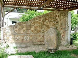 - فسيفساء لقاء الإلاه مارس وريا سلفيا التي تتميز إضافة الى الرمز المركزي بزخارفها الهندسية ذات الألوان الحية.