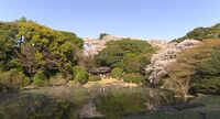 Ueno Park was founded in 1873 on land that had been held by the metropolitan government since the destruction of most of the Kaneiji Temple during the Boshin War that established the Meiji Restoration,[7] partially following the example set by the American government at Yellowstone the preceding year.[14] Hisanari Machida, the museum's first director, had advocated the use of the spacious park for a wide-ranging museum as early as 1873 but parts of it were used for the military and education ministries until 1875, when the Home Ministry acquired complete control.[7] The museum's early conception was based on the South Kensington Museum (now the Victoria & Albert Museum) in London,[15] but important changes were made. The museum collections were divided into the eight categories of fine arts, nature, agriculture & forestry, history, law, education, industry, and land & sea.[5] The ministry gave the entire park to the museum in January 1876 but its facilities there weren't completed until 1881, when the original Honkan was completed in time for the Second National Industrial Exhibition; the smaller brick building used by the first National Industrial Exhibition in 1877 was incorporated into this as a wing.[7] In April 1881, the museum was moved from the Home Ministry to the Ministry of Agriculture and Trade. It began construction on the associated zoo[7] and added the Asakusa Bunko collection to the museum as its book department.[16]