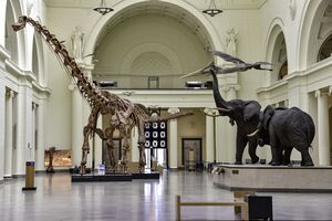The museum maintains a temporary exhibition program of traveling shows as well as in-house produced topical exhibitions.[13] The professional staff maintains collections of over 24 million specimens and objects that provide the basis for the museum's scientific-research programs.[4][7][14] These collections include the full range of existing biodiversity, gems, meteorites, fossils, and extensive anthropological collections and cultural artifacts from around the globe.[7][15][16][17] The museum's library, which contains over 275,000 books, journals, and photo archives focused on biological systematics, evolutionary biology, geology, archaeology, ethnology and material culture, supports the museum's academic-research faculty and exhibit development.[18] The academic faculty and scientific staff engage in field expeditions, in biodiversity and cultural research on every continent, in local and foreign student training, and in stewardship of the rich specimen and artifact collections. They work in close collaboration with public programming exhibitions and education initiatives.[14][19][20][21]