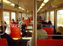 منظر داخلي للمقطورة. وتبدو أماكن الجلوس التي تتسع لـ 46 ركاب وأماكن الوقوف التي تتسع لـ 160راكباً بحيث يصبح عدد الركاب الإجمالي 206راكباً في المقطورة الواحدة