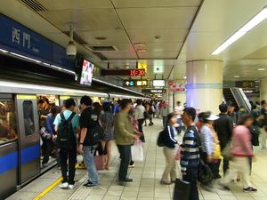 Ximen Station on the Blue Line of the Taipei Metro. Rapid transit allows for high passenger throughput.