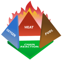 مثلث النار fire triangle أو مثلث الاشتعال combustion triangle هو مثلث نموذج بسيط من علم الاطفاء ، فهم المكونات اللازمة لمعظم الحرائق. وقد تم استبدال كبيرة في الصناعة من النار رباعي الأسطح التي تقدم اكمل النموذج كما يرد ادناه. "مثلث" يوضح ان القاعده لتفجير وأشعال النار ، يتطلب ثلاثة عناصر التدفءه ، محروقات واوكسجين. منع الحريق او تقضي عليها "ازالة" كل واحد منهم. حريق يحدث طبيعيا عندما العناصر المشتركة في حق الخليط (منه ، اكثر الحراره اللازمة لتفجير بعض الوقود ، ما لم يكن هناك تركيز الأوكسجين. عندما تنفد النار من الوقود وتوقف. وقود يمكن ازالتها طبيعيا ، فإذا النيران قد استهلكت جميع بورنابلي الوقود أو يدويا من ميكانيكيا او كيميائيا إزالة الوقود من الحريق. الوقود بين عامل مهم في اخماد الحرائق البرية ، والأساس الرئيسي لمعظم الاساليب. آخر الوقود كما يمكن تغييره كيميائيا لمنعهم من حرق عادي في درجات الحراره ربما كجزء من اجراء لمنع نشوب الحرائق. كافية حرارة الحريق ، لا يستطيع أبدا ، ولا يمكن ان يستمر. الحراره يمكن ازالة بعض أنواع من اخماد النيران بالمياه ؛ الماء يتحول إلى بخار ، مع اخذ الحراره. علما بأن المياه علا او زيادة انتشار بعض انواع الحرائق (مثل المعادن اشتعال حرائق انظر الملاحظات ادناه). الفصل احتراق الوقود من بعضها البعض ويمكن ان يكون طريقة فعالة لخفض الحراره. حرائق الغابات وحرق سجلات فصل ووضع في المناطق الامنه التي لا يوجد أي وقود آخر. الغاء خرجت من احراق الهيكل أيضا ازالة مصدر الحراره. تحول من الكهرباء في حريق كهربائي يزيل الحراره المصدر رغم أنه قد يكون وقود النيران المشتعله تستمر حتى يتصدى لها واطفاء الحريق عن ثلاثيات أيضاً. الاكسجين يمكن الاستغناء عن الحريق الذي خنق هو مائي مع رغوه أو بعض الغازات الخاملة) منه ، ثاني أكسيد الكربون والهالون والمواد الكيميائية الجافة أو أنها تضم يها النار بسرعة حتى تستخدم كل ما لديها من الاوكسجين. شمعة مطفءه الشموع