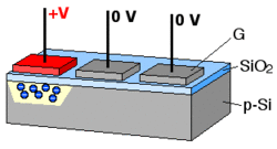 One should note that the clocking of the gates, alternately high and low, will forward and reverse bias to the diode that is provided by the buried channel (n-doped) and the epitaxial layer (p-doped). This will cause the CCD to deplete, near the p-n junction and will collect and move the charge packets beneath the gates – and within the channels – of the device.