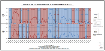 رسم بياني تاريخي للسيطرة الحزبية في مجلس الشيوخ ومجلس النواب، فضلاً عن الرئاسة[5]