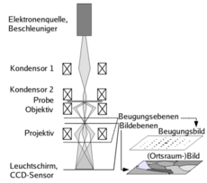 يستغل المجهر الإلكتروني خاصية ازدواجية موجة-جسيم للإلكترون أي تعالج الإلكترون بنفس معالجة الموجات الضوئية حيث تقوم هنا عدسات مغناطيسية مقام العدسات الضوئية المعتادة في تركيز وضبط شعاع الإلكترونات.