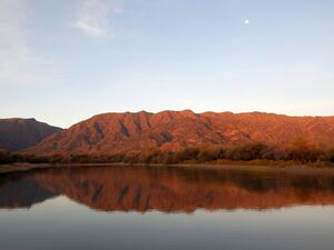 West of these valleys, the Sierras Grandes form the highest chain in the province: their altitude increases gradually to form a plateau of 2،000 إلى 2،300 متر (6،600 إلى 7،500 ft) known as Pampa de Achala, culminating with Cerro Champaqui on the western part, at 2،790 متر (9،150 أقدام). West of these mountains, there is an impressive drop towards the valley known as Valle de Traslasierra, and across the valley, the Sierras Orientales reach an altitude of 1،650 متر (5،410 أقدام) at Cerro Yerba Buena. In the northeast corner of the province, a natural depression forms an extensive salt lake called Laguna Mar Chiquita. The actual surface of the lake is 6،000 km2 (2،300 sq mi), but during extended dry periods (such as in the 1980s) it can be a third of that, with much higher salinity. The southeastern part of the province is home to numerous ponds, lakes, and wetlands.