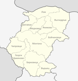 The Montana province (Област, oblast) contains 11 municipalities (singular: oбщина, obshtina - plural: Общини, obshtini). The following table shows the names of each municipality in English and in Cyrillic, the main town (in bold) or village, and the population as of 2011.