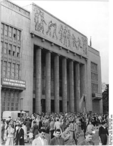 Communists gathering in East Berlin at the Deutsche Sporthalle of Karl-Marx-Allee, in "solidarity with the French people against Fascism"