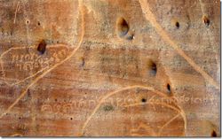على الجدران توجد خربشات الرعاة الأميين التي تظهر جمالاً ضخمة جداً بالمقاس الطبيعي وأيضاً يلاحظ كثرة رسوم الخيل كما توجد نقوش ثمودية ونقوش عربية قديمة منها أدعية بالغفران بحروف عربية غير منقوطة وكذلك نقوش عربية وشعر نبطي.
