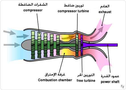 رسم تخطيطي يظهر كيفية عمل لمحرك عمود دوار مبسط. بكرة شفرات الضاغط compressor بالأخضر وتوربين القدرة الحر بالبنفسجي.