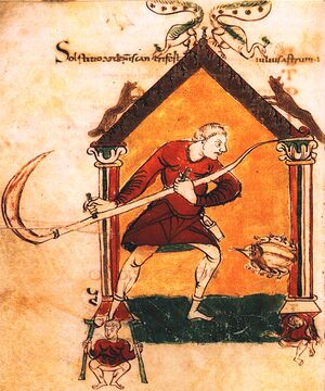The Dictionary of Greek and Roman Antiquities of Sir William Smith argues that the scythe, known in Latin as the falx foenaria as opposed to the sickle, the falx messoria, was used by the ancient Romans.[بحاجة لمصدر] According to ancient Greek mythology, Gaia – the Greek goddess and mother of the Titans – gave a sickle made of the strongest metal to her youngest son Kronos, who is also the youngest of the Titans and god of the harvest, to seek vengeance against her husband Ouranos for torturing their eldest sons. The Grim Reaper is often depicted carrying or wielding a scythe. According to Jack Herer and Flesh of The Gods (Emboden, W. A. Jr., Praeger Press, New York, 1974), the ancient Scythians grew hemp and harvested it with a hand reaper that would be considered a scythe.[بحاجة لمصدر]