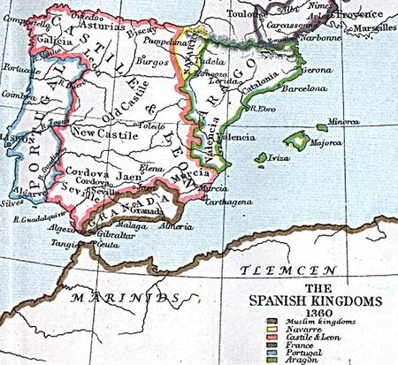 Granada was located between two larger neighbours: the Christian kingdom of Castile to the north and the Muslim Marinid state centred in today's Morocco to the south. Castile's objectives were to keep Granada in check, prevent it from conducting raids and force it to continue paying tribute.[12] The tribute amount was 300,000 maravedís—about half of Granada's revenue—and represented an important source of income for Castile, though Granada often suspended payments.[13][14] On the other hand, the Marinids, following in the footsteps of their Almohad and Almoravid predecessors, saw the protection of the Muslims in the Iberian peninsula, as well as participation in jihad against the Christian expansion there—the so-called "Reconquista"—as their duty as Muslims and as a way to increase their legitimacy.[15][16] By the time of Muhammad II's rule, Granada's main objective was to maintain independence from both of these powers, preserve the balance of power, prevent an alliance between them, and control towns on the Castilian frontiers as well as ports on the Strait of Gibraltar, such as Algeciras, Tarifa, and Gibraltar.[12][17] The contest over control of these strategically important ports, which controlled passage to and from North Africa,[18] lasted until the mid-14th century, in what modern historians call the "Battle of the Strait" (Batalla del Estrecho).[16]