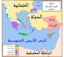 الدولة العثمانية والدول والإمارات المحيطة بها عام 1450، أي قبل تربّع محمد الثاني على العرش بسنة واحدة.
