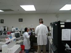 Clinical laboratory in a Hospital setting showing several automated analysers.