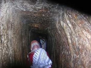 وبالاتجاه جنوباً نزولا بسلم حديدي الى مدخل قناة عين سلوان العكسي، تجد بناءً بشرفتين للايحاء بأن عائلات سكنت في المغارة التي حفرها اليبوسيون داخل المدينة لتأمين الماء في أوقات الحصار وجعلوه على شكل درج ينزل إلى العين. تعبر "آفاق البيئة" نفق مجرى العين -التي يسميها الاحتلال بعين جيحون- الضيق والذي لا يزيد عرضه نصف متر وطوله عن 170 سم، تبعد العين حوالي 300 متر عن الزاوية الجنوبية الشرقية لسور المسجد الاقصى وتخرج من باطن الأرض منذ أكثر من 5000 عام. وللأسف وبالرغم من كونها وقف اسلامي، لكن تسيطر جمعية "إلعاد" الاستيطانية على المواقع السياحية في وادي حلوة بما فيها المدخل الشمالي لعين سلوان والنفق المائي المؤدي لبركة سلوان، وتستقبل الجمعية الاستيطانية مجموعات السياح وتعمل على تقديم القرية على أنها "مدينة داوود" توراتية. ختم د. بكيرات بعد ان اغتسل بمياه العين المباركة: "التهويد يبدأ من داخل المدينة الى خارجها في وادي حلوة وسلوان، وصولا الى العين الوقفية وكل ذلك لتثبيت وجودهم المزعوم ولازدهارهم السياحي، نحن امام مشروع لتفريغ السكان، عبر فصل الاحياء العربية عن المسجد الاقصى وإقامة ابنية اسرائيلية ذات طابع يهودي، من اسكان وتجارة واقتصاد، وفي المقابل قتل أي شكل من اشكال الحياة الفلسطينية.