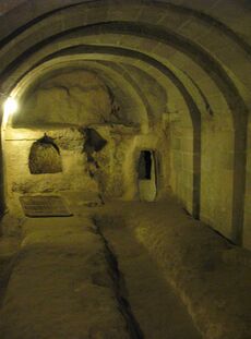 The city could accommodate up to 20,000 people and had amenities found in other underground complexes across Cappadocia,[2][3] such as wine and oil presses, stables, cellars, storage rooms, refectories, and chapels. Unique to the Derinkuyu complex and located on the second floor is a spacious room with a barrel-vaulted ceiling. It has been reported that this room was used as a religious school and the rooms to the left were studies.[4]