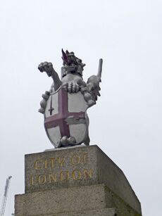 The boundaries are marked by black bollards bearing the city's emblem, and by dragon boundary marks at major entrances, such as Holborn and the south end of London Bridge. A more substantial monument marks the boundary at Temple Bar on Fleet Street.