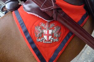 The Corporation of the City of London has a full achievement of armorial bearings consisting of a shield on which the arms are displayed, a crest displayed on a helm above the shield, supporters on either side and a motto displayed on a scroll beneath the arms.[35][36][37]