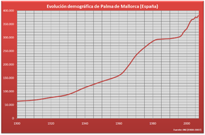 منذ الخمسينات ، غير مجيء السياحة الجماعية جذريا كل من المدينة والجزيرة ، وحولها إلى مركز جذب للزوار وجذب العمال من إسبانيا. ساهم ذلك في تغيير ضخم في التقاليد ، والخريطه الاجتماعية ، والتحضر والولع بالاقتناء. تسبب ازدهار السياحة في ان تنمو بالما بشكل كبير ، مع تداعيات على الهجره.في عام 1960 زوار مايوركا كانوا 500000 ، في عام 1997 ، زار مايوركا أكثر من 6739700. في 2001 الشعب استخدم مطار بالما أكثر من 19200000 ، مع 1،5 مليون اضافي قادم عن طريق البحر.[5]