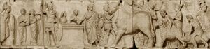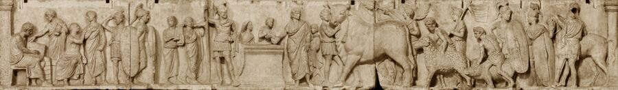 The historic panel of the base, 5.65 metres long, 0.80 metres high and 0.015 metres thick, is a bas relief of Parian marble, depicting the different stages in a census of the Roman citizen body.[3] The relief, which is one of the first examples of the continuous narrative style,[m 3] is read from left to right and can be divided into three scenes: the recording of the Roman citizens in the register of the censor, the purification of the army before an altar dedicated to Mars and the levy of the soldiers.
