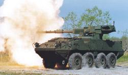 A M1128 Mobile Gun System tank destroyer firing its 105 mm cannon