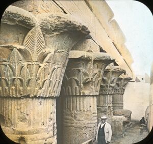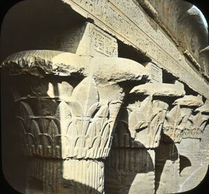 With the exception of the jamb of a gateway—now converted into a door-sill—of the reign of Thutmose II (Eighteenth Dynasty), the remains of Latopolis belong to the Ptolemaic or Roman eras. Ptolemy III Euergetes, the restorer of so many temples in Upper Egypt, was a benefactor to Latopolis, and he is depicted upon the walls of its temple followed by a tame lion, and in the act of striking down the chiefs of his enemies.