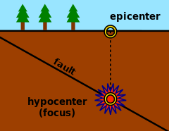 The point at which fault slipping begins is referred to as the focus of the earthquake.[4] The fault rupture begins at the focus and then expands along the fault surface. The rupture stops where the stresses become insufficient to continue breaking the fault (because the rocks are stronger) or where the rupture enters ductile material.[4] The magnitude of an earthquake is related to the total area of its fault rupture.[4] Most earthquakes are small, with rupture dimensions less than the depth of the focus so the rupture doesn't break the surface, but in high magnitude, destructive earthquakes, surface breaks are common.[4] Fault ruptures in large earthquakes can extend for more than 100 km (62 mi).[4] When a fault ruptures unilaterally (with the epicenter at or near the end of the fault break) the waves are stronger in one direction along the fault.[7]