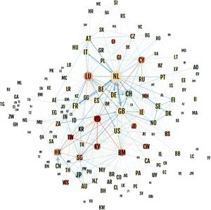 Uncovering Offshore Financial Centers: CORPNET's network of connections between countries splitting into Conduit OFCs and Sink OFCs.[9]