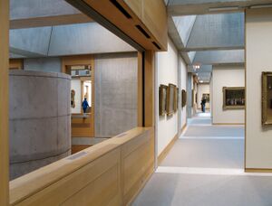 The Yale Center for British Art was completed after Kahn's death in 1974, and opened to the public on April 15, 1977. The exterior is made of matte steel and reflective glass; the interior is made of travertine marble, white oak, and Belgian linen. Kahn succeeded in creating intimate galleries where one can view objects in diffused natural light. He wanted to allow in as much daylight as possible, with artificial illumination used only on dark days or in the evening. The building's design, materials, and sky-lit rooms combine to provide an environment for the works of art that is simple and dignified.[5]