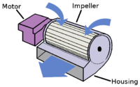 • مروحة تدفق عرضي - Crossflow fan:يندفع الهواء عمودياً على المحور دخولاً من زاوية وخروجا من زاوية أخرى. يوجد هذا النوع من المراوح في المكيفات المركزية (التدفئة والتهوية وتكييف الهواء) بشكل خاص.