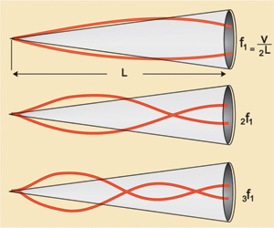 حيث v سرعة الصوت في الهواء. يبين الشكل (2) تشكل التوافقيات الثلاث الأولى في هذا الأنبوب المخروطي.