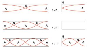 يمثل الشكل (1) توزع العقد والبطون للأنماط الاهتزازية الثلاثة الأولى في أنبوب مفتوح (على اليسار) وأنبوب مغلق (على اليمين). وقد أشير إلى العقد بالحرف N وإلى البطون بالحرف A.