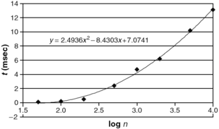 The graph shows the running time vs. problem size for a knapsack problem of a state-of-the-art, specialized algorithm. The quadratic fit suggests that the algorithmic complexity of the problem is O((log(n))2).[6]