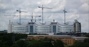 The new hospital was procured under a Private Finance Initiative contract with Consort Healthcare signed in early 2006.[11] The hospital was designed by BDP Architects and construction, which was undertaken by Balfour Beatty[11] at a cost of £545 million, began in June 2006. Five Liebherr 280 EC tower cranes were used during construction. Three of the cranes were among the tallest free-standing structures in the UK. One of the cranes was at its maximum free-standing height, 90.2 m (295.9 ft) under the hook and could lift 12 t at 27.9 m (91.5 ft) or 4.9 t at 60 m (197 ft). The other two cranes stood at 79.5 m (260.8 ft).[12]