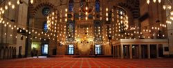 وهو مستطيل قريب إلى المربع، حيث طوله 69 م وعرضه 63 م، ويتسع لنحو خمسة آلاف مصل. وبدلاً من الزخارف والنقوش المبالغ فيها في كثير من المساجد العثمانية فيتسم نلاحظ النضج والبساطة. وتم استخدام البلاط التركي المصقول، والتصاميم ذات الصقل المظلل المؤلفة من سبعة ألوان بما في ذلك اللون الأحمر الارجواني مع خطوط بيضاء وسوداء، واللون الأزرق الفائق، والتي تكسو الجدران الداخلية لبيت الصلاة بزخارفها التي جاءت على شكل زهور التوليب والقرنفل والجوري والبنفسج والاقحوان وأوراق العنب وأشجار التفاح والسرو.[1]